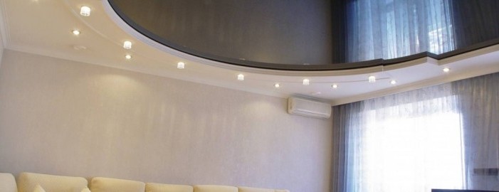 - Занадто висока стеля здається вам незатишною? Підійде незвичний варіант – темне покриття та світлі стіни. За бажанням можна опустити натяжну стелю на бажаний рівень.