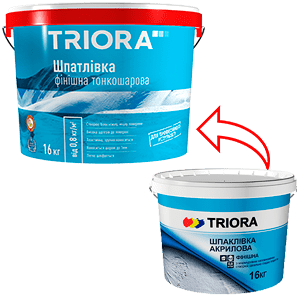 • Шпатлевка акриловая финишная TRIORAAre there only small nuances? Well, it is enough to apply a thin layer of material. Finish putty by TRIORA can be applied with the thickness of layer up to 1 mm. It creates a flat, snow-white surface. It is better to use this material for those walls that you just need to improve before further work.