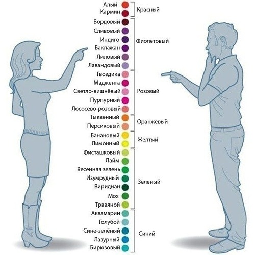 Розповідають, що мешканці північних країн розрізняють кілька відтінків снігу. Нібито це багато у чому допомагає їм у хазяйських справах. Який сніг для жителів півдня? Правильно, просто білий. Чим більше та частіше людина спостерігає різноманітні гами кольору, тим гостріше вона відчуває різницю у відтінках. Широким сприйняттям кольорів відрізняються художники, дизайнери – вони працюють із величезною палітрою, спостерігають сотні кольорів і тому набагато чутливіші до них, аніж інші люди. Близькі до цього й особливості жіночого сприйняття. Обираючи косметику, тканини та одяг, жінка впізнає різні відтінки кольору. Більшості ж чоловіків для комфортного життя досить розуміти основні кольори.