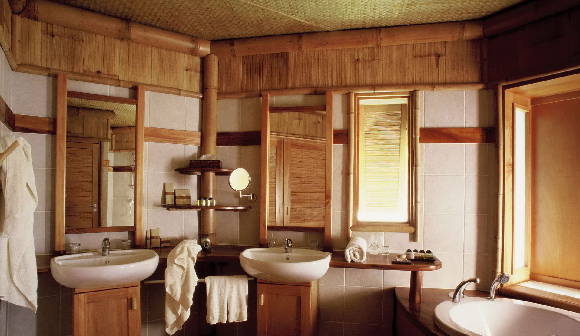 - У ванній обов’язково хороше яскраве освітлення. Якщо ж хочете дотриматися стилістичних особливостей, оберіть декілька відповідних світильників. Усе інше світло можна заховати за підвісною стелею.